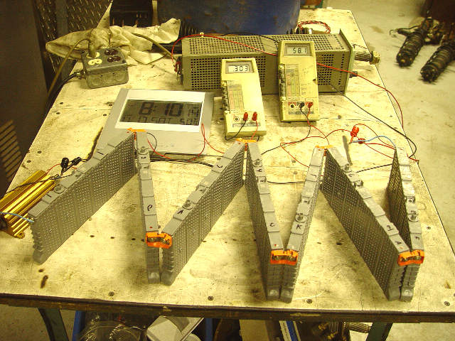 In years past I have used a capacitor to zap shorted NI CAD batteries back to life. I ran some test on the first stick from Ron's shorted cell pile of subpacks. Cell #1 (most positive) was lower voltage than than the others an hour after the stick was taken off the overnight 350MA charge. I put a 3 A charge across the low cell, and instead of raising in voltage, it dropped, as it began to short. I dug out the stored energy demo from the hybrid car class. We use it to show why you need to turn off the switch and wait for the capacitors to discharge before touching anything. The 6100uF cap has copper buss bars, and a voltage doubler circuit to get 350VDC from the 120V AC line. I charged the cap to ~100V and discharged it right on the heavy brass wingnuts.After A look at the voltage under charge, and still shorting. Another zap this time @ 250VDC and the short is gone, and then for good luck, I charged the cap to 350VDC and zapped the whole subpack. You can see that each discharge generates a divot in the brass nut and capacitor buss bars. Wear ear and eye protection as it sounds like an M80 going off, and molten metal can spray out if you don't make the contact fast and hard. Lots of the capacitor energy is not making it to the cell, and is making explosive metal plasma. After confirming that the cell voltage was rising at about the same rate as the other cells, I put the whole subpack on a 3A charge until the cells were at 90%, then finished with a 350MA for several hours. Final cell to cell voltage while under charge was within 0.05V Will see what happens overnight and do more testing tomorrow.