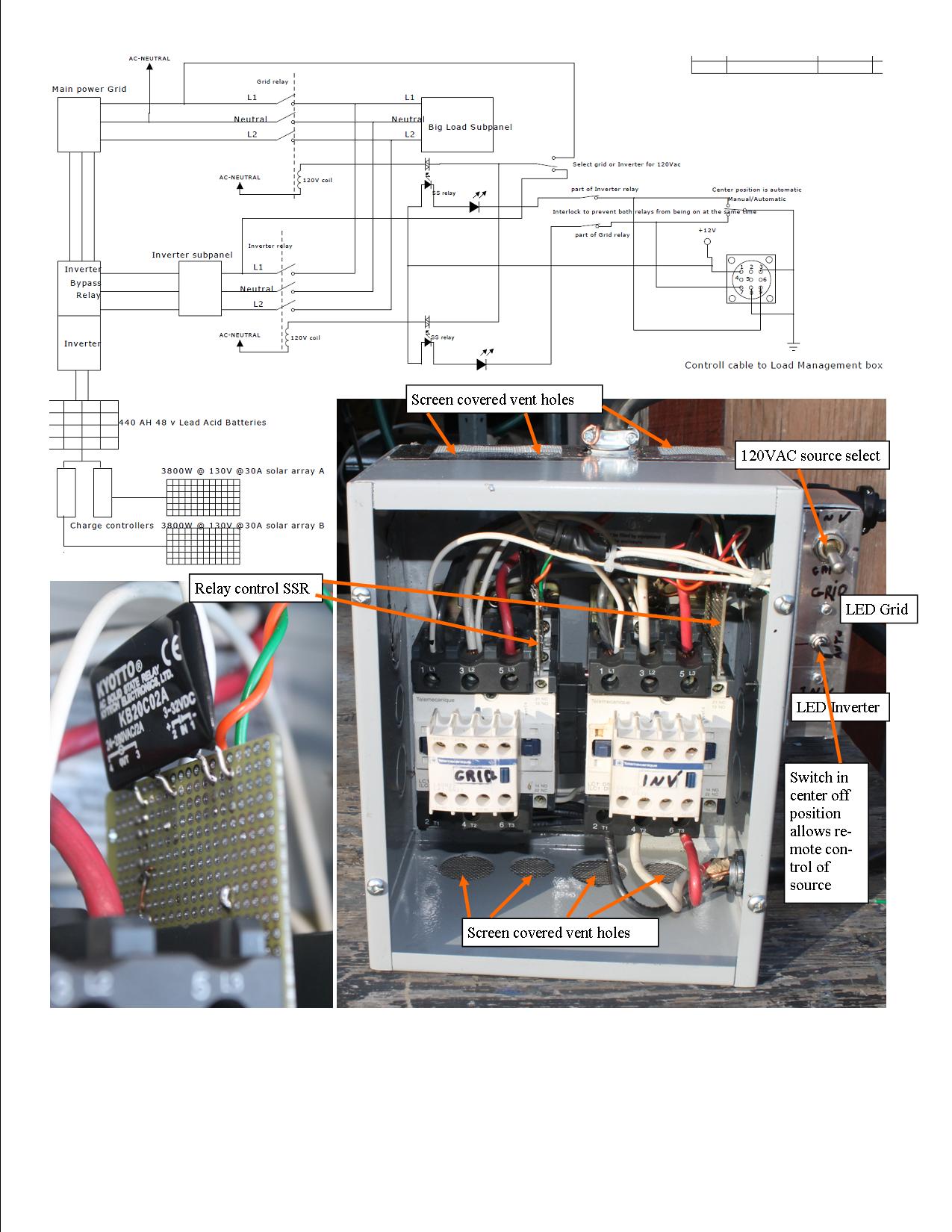 The load management system would need to know when an appliance is turned on, and then the actual application of power would be processed by the management computer, which would turn on the solid state relay and the load. Each load would be assigned a priority. and when none of the on demand loads are on, the excess energy would make hot water, compressed air, or electric heat. At night, the big loads would be turned off, and the energy stored as compressed air, hot water, or energy stored in the house as heat would carry until the next day, so the batteries will last all night. The highest priority will be to recharge the batteries, then when the charge controller goes into float, and turns on the Aux relay to divert the excess energy where it does the most good. The fun is just beginning.