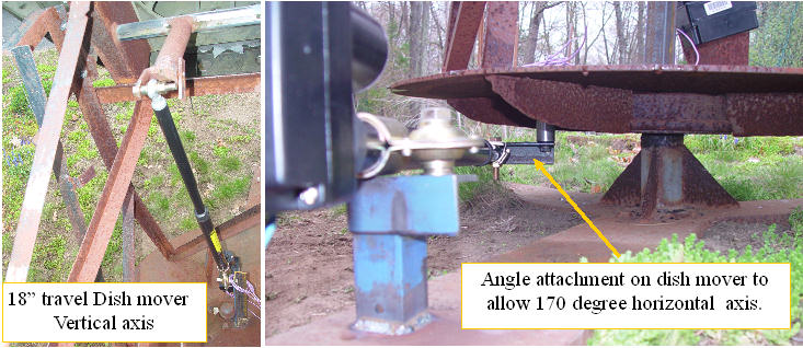 Taking a break from the bucket truck, I finally got the two 18" dish movers mounted on the big Solar furnace. The vertical axis was easy, I used the old actuator arm on top, and welded up a simple bracket on the bottom. The actuators have adjustable stops, which I adjusted so the travel was full range without hitting the stops. The horizontal axis was a bit more work, as the VW wheel, and stiffening webs only gave a narrow path for the actuator shaft to pass by. I wanted as near to 180 degrees of rotation as possible, so an offset bracket was made for the dish side so the actuator would clear the mounting shaft. It is a bit heavily loaded when at the two extremes of travel,because of steep actuation angle, but is smooth and strong every where else.Next the water proof box for the electronics.
