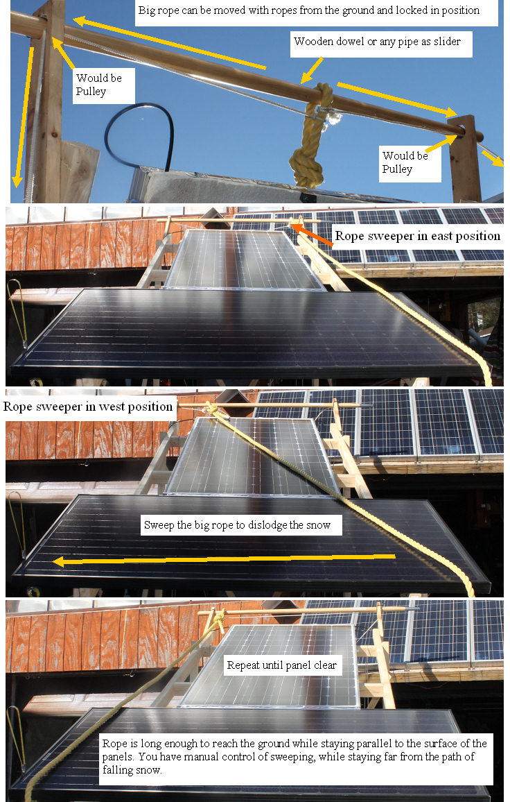 Time to go back to a more mechanical way to clear the snow. After beating on some snow drifts with various things, I came up with a pretty simple to make,low cost and potentially useful way to get snow to slide off the panels.The same system could also clear roofs. In all the test i have did to date trying to melt the snow,I found that all that is required to fully clear a panel is to give the snow a nudge, and then the snow just slides off with gravity's help. A bar, pipe, dowel is supported above the panels.This needs to be rigidly attached so you can pull as hard as necessary to get the snow moving. A 3/4" diameter poly rope is attached loosely with a loop. The loop can be pulled left or right with a smaller diameter rope, which would pass through pulleys on the left and right ends. By pulling on the small ropes, you can slide the loop anywhere along the bar, and hold it there if the ropes are tied down. To clear snow, you would pull on the big poly rope end on the ground, far enough from the building to put the rope parallel to the panels surface. Then you just pull and sweep the rope across the surface to clear the snow. This means I would have to snow blow a path at the right distance from the house to get the angle right, but that is not as difficult or dangerous as getting on the roof. The top can be moved left or right to sweep multiple times, all far from the house, away from falling snow.A small cleat to tie down the two small ropes would lock the top loop in position. Would work best the morning after the storm, when the snow is fresh. Leave the ropes set up all winter, and put a top slide across all of the house peaks to allow clearing either side of the roof with the same bar and separate ropes. Sounds good on paper, the real test will come when it snows again. The same rope can be used to support the end of a very long snow rake.Imagine a pulley that the rope runs through right above the rake. The rope is held in one hand, the snow rake handle in the other. Lift the rope to get the snow rake end over the snow, push the rake up to get another bite of snow, pull down the snow. I hope that the rake would only be required if the snow is too much for the rope alone. I also rigged up another poly rope tied to the base of my chimney over the panels and to the ground, so I can test clearing a limited sweep of the real panels to see how it works. Now all I need to try it out is another snow storm.