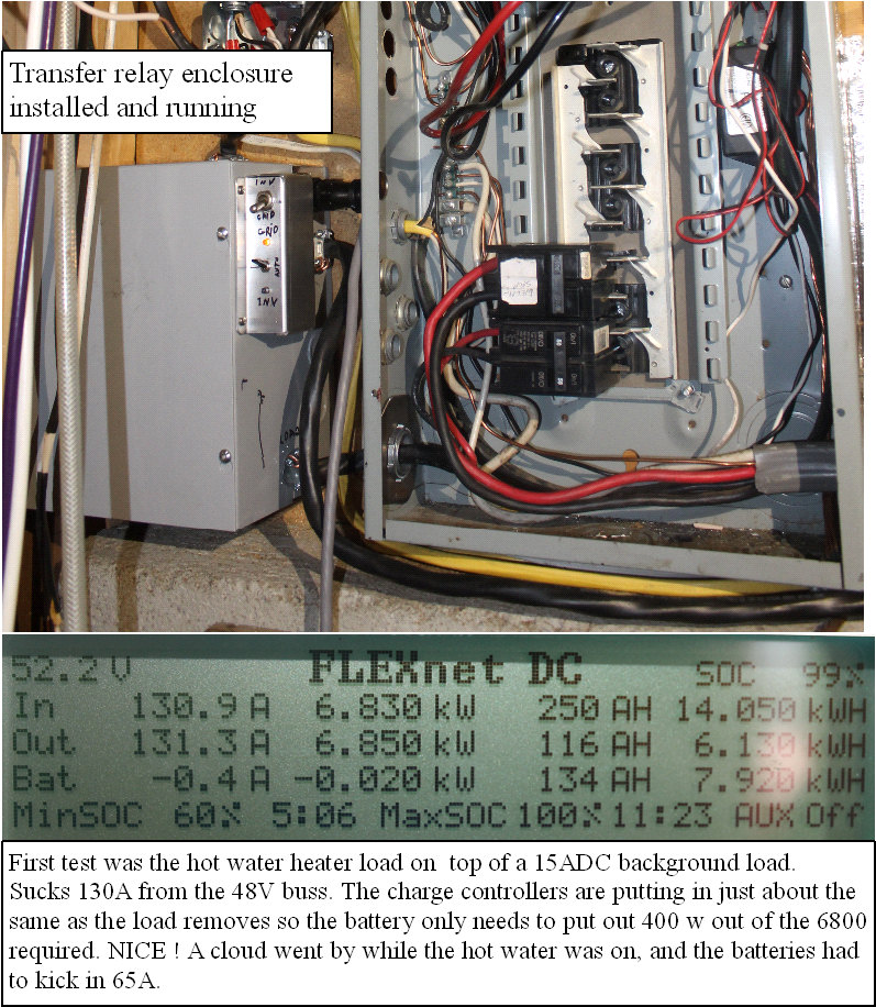 Got the new transfer relay box mounted and wired in. This powers the big load manager buss in the main panel, from either the grid or the inverter, and can be remote controlled. It was a sunny day today, so I moved the hot water heater over the the new high load buss, and ran some hot water to see how the system would handle it. It took almost 7KW, and well over 100Afrom the 48V system to run the big heater, but the solar input and the charge controllers were able to keep up and the heater cycled off after 10 minutes. Will leave the hot water heater off all night, and recharge it once the batteries get recharged tomorrow, and see how much recovery is required. The system monitoring to best use the available power is going to be tricky to tweak due to the wide variability in solar input.