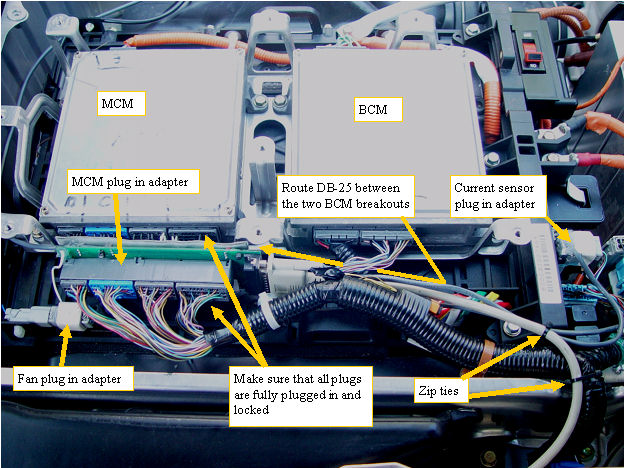 The MCM plugin adapter is plugged in between the stock harness and the MCM computer. Make sure the plugs are fully seated and locked.The fan plug in adapter and the current sensor plug in adapters are simply plugged in between the stock harness and the mating plug. The adapter uses amp tyco sockets on the slightly larger pins in the stock female socket. If the adapter does not easily plug in,do not force it,the pins may simply not line up exactly with the sockets in the plug. Simply pull the plug in adapter back out and try again at a slightly different lead in angle. Once the pins start into the connector the plug in adapter should fully seat into the socket and lock into place. The stock connector is then plugged into the adapter to complete the circuit.
